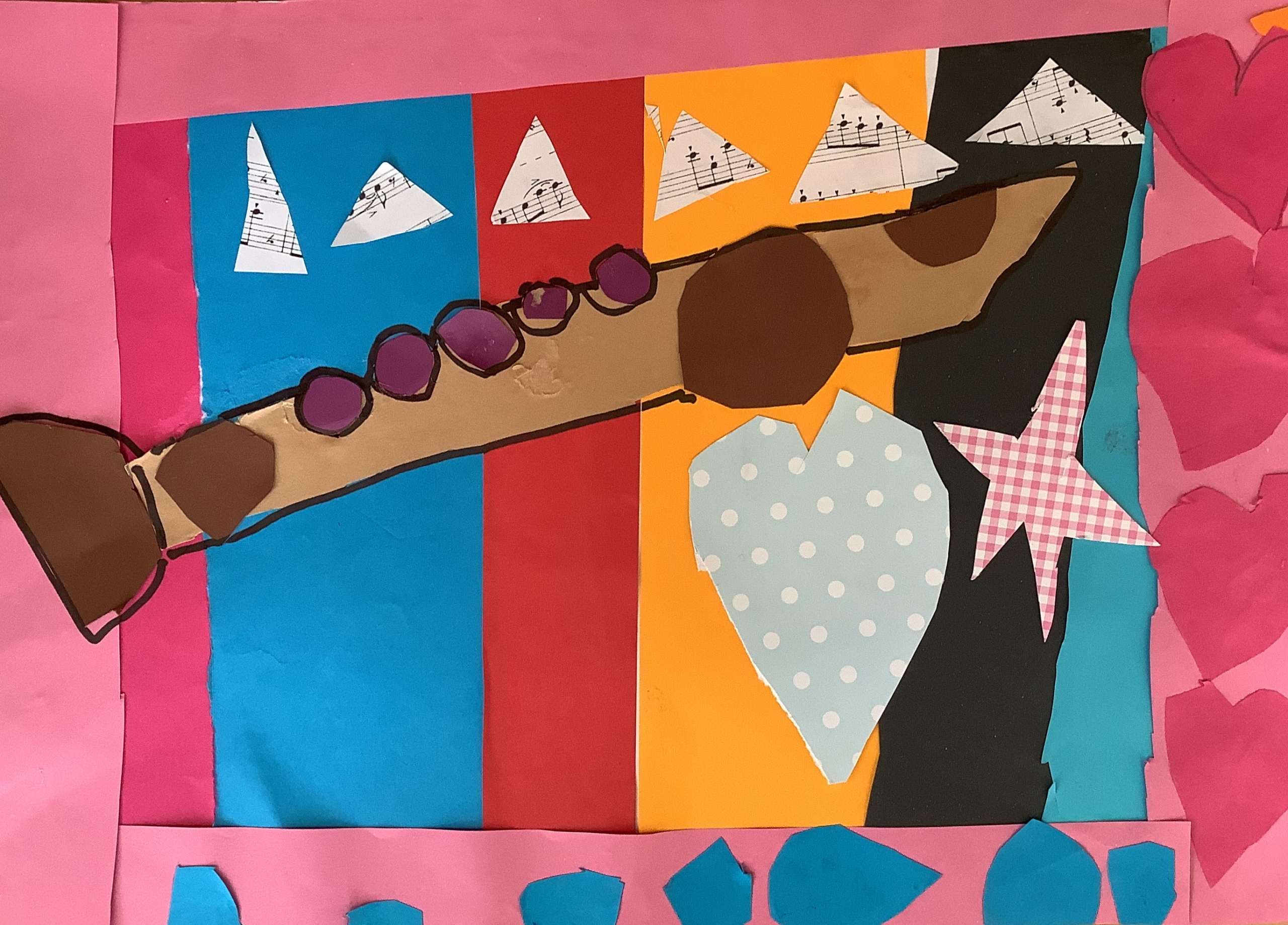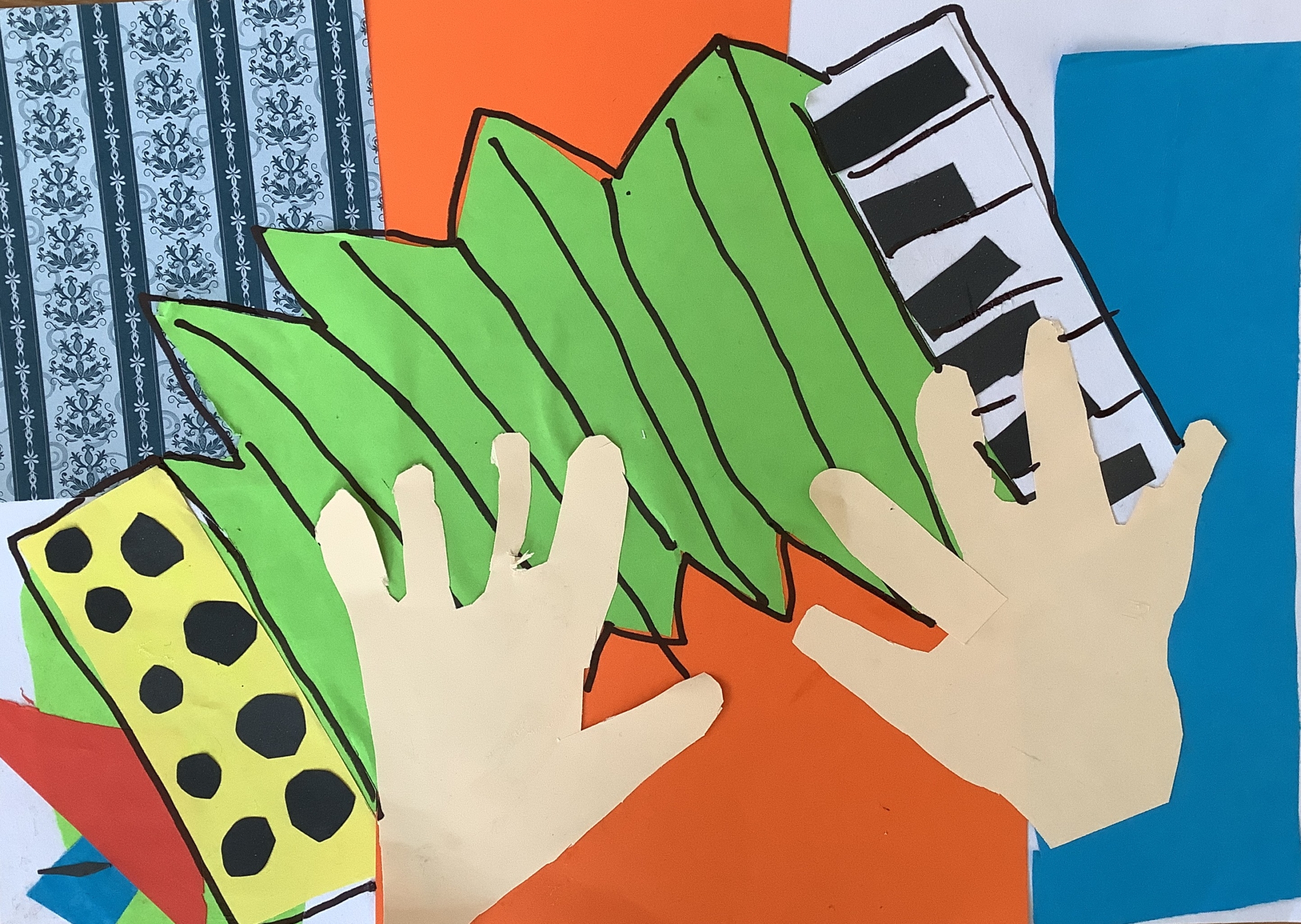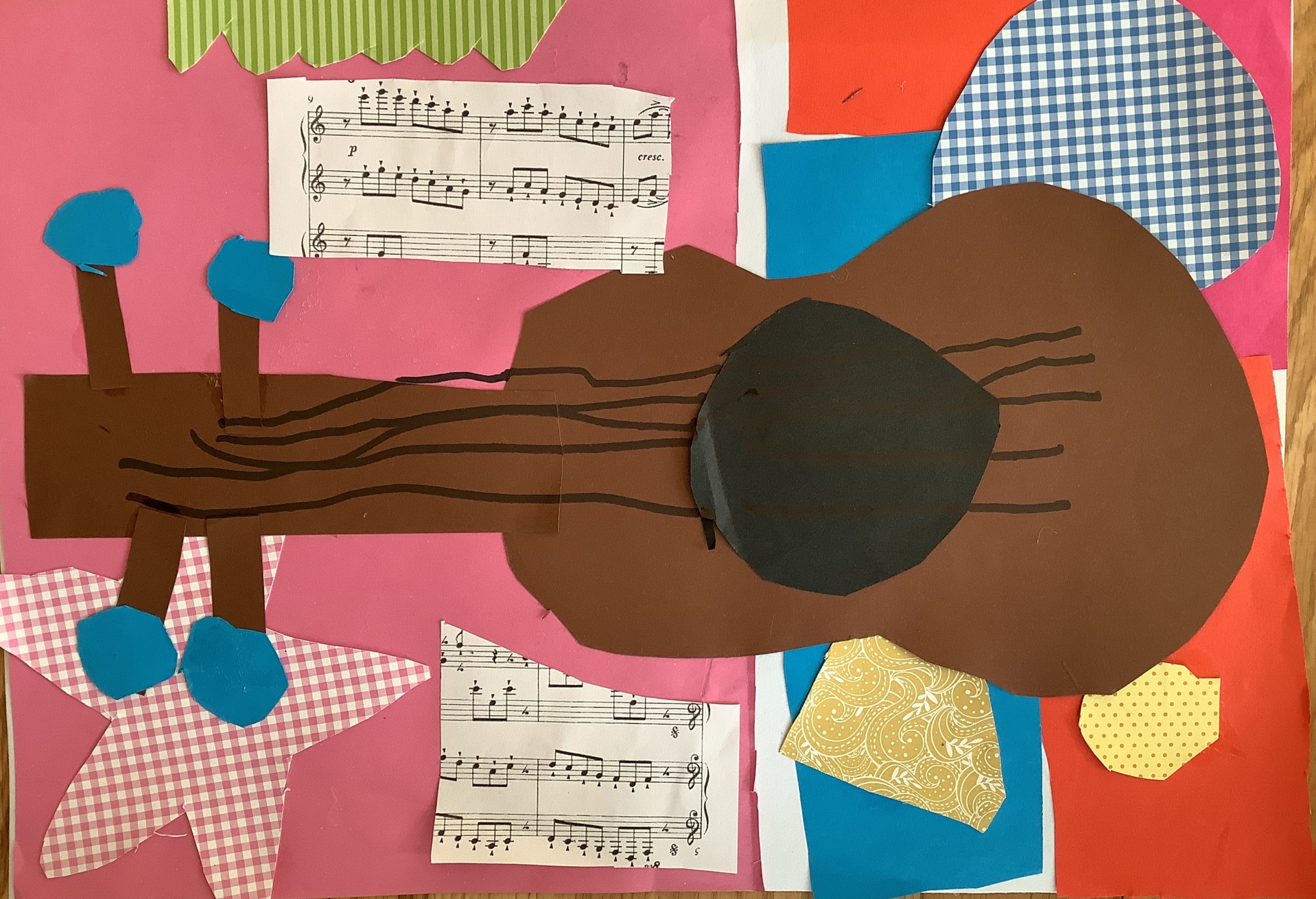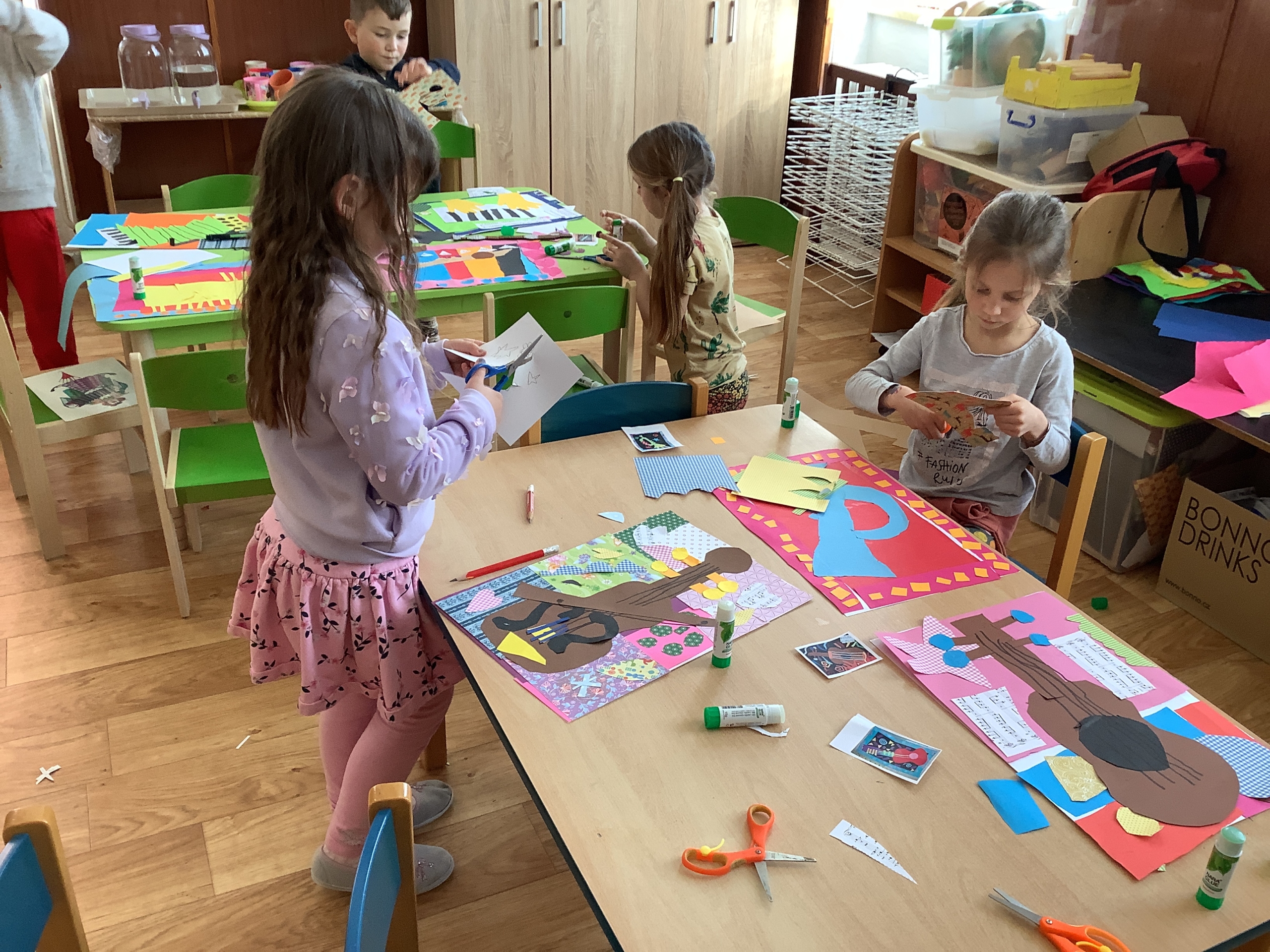 | Dílčí cíl: Vytvořit jednoduchou koláž skládáním a lepením papírových tvarů do podoby hudebního nástroje. Dokázat využít fantazii a stylizovat předmět netradičním způsobem podle vlastní představy. Pochopit, že obraz může být složený z tvarů a nemusí být realistický. |