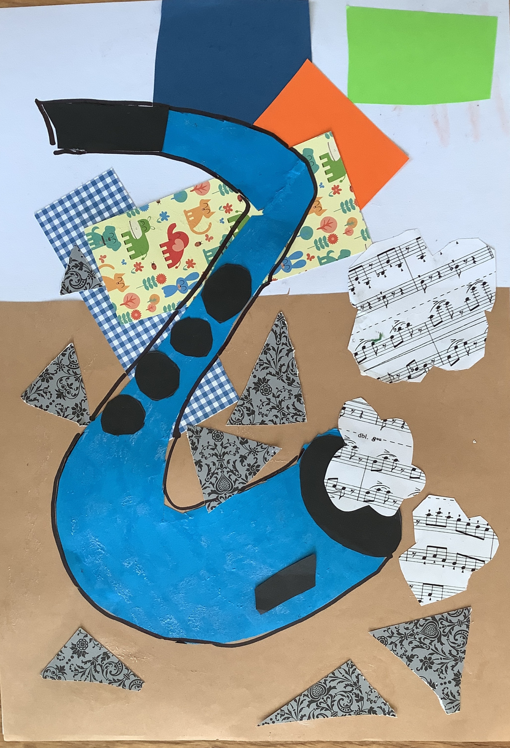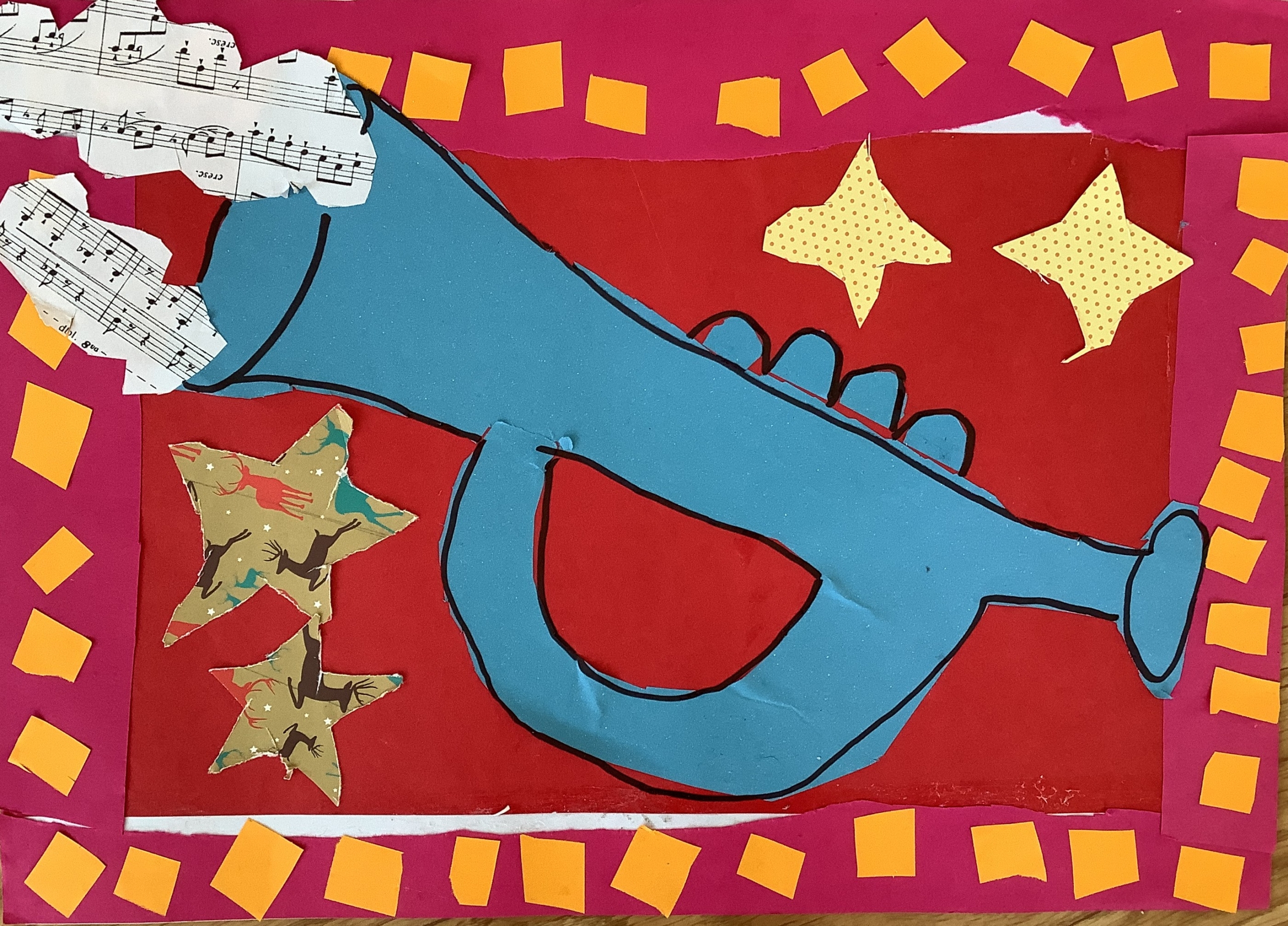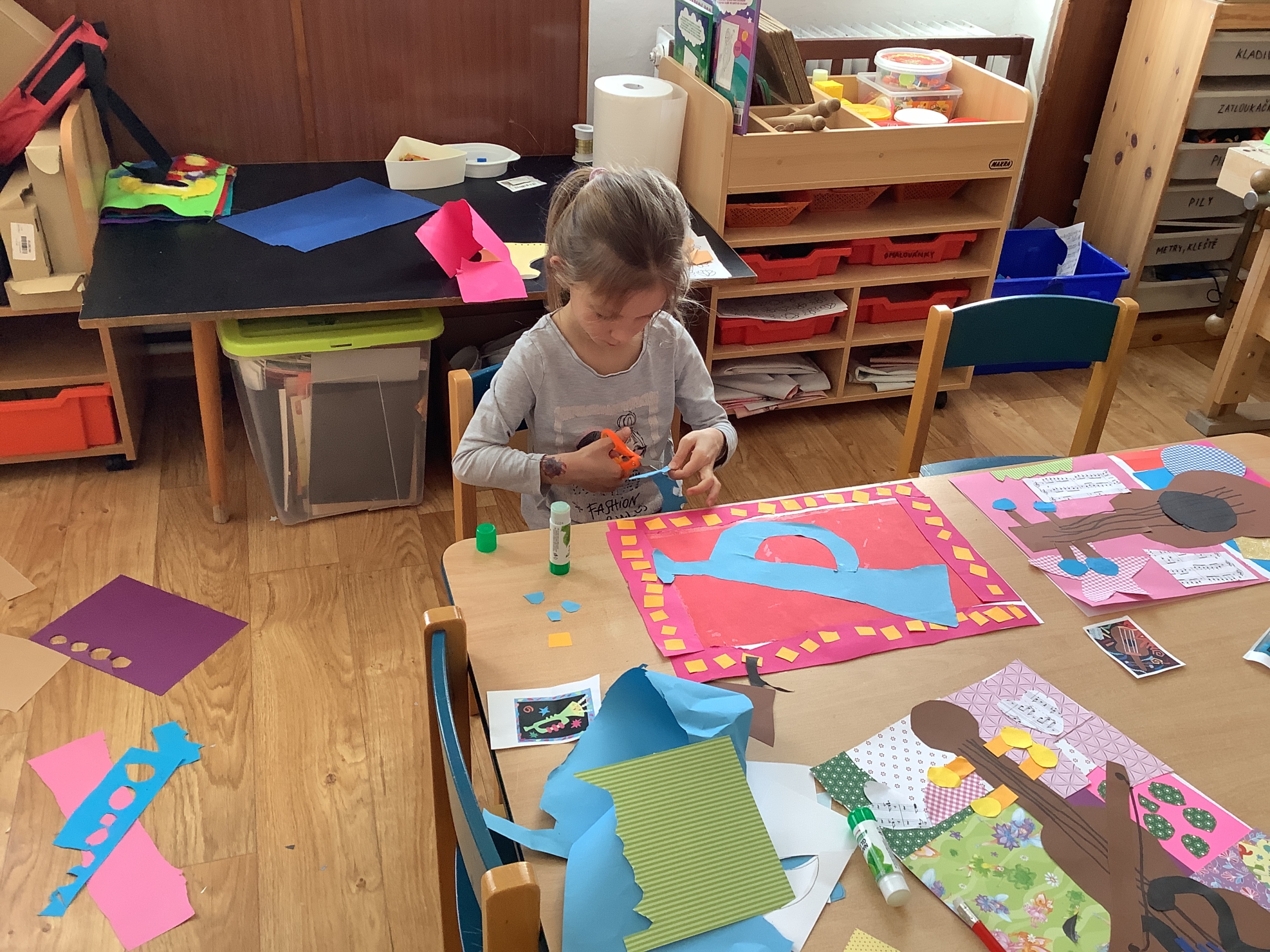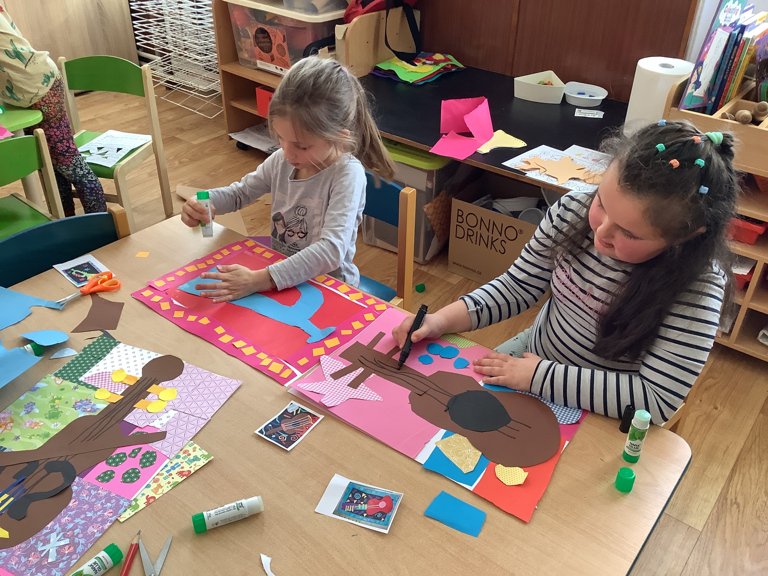 | Dílčí cíl: Vytvořit jednoduchou koláž skládáním a lepením papírových tvarů do podoby hudebního nástroje. Dokázat využít fantazii a stylizovat předmět netradičním způsobem podle vlastní představy. Pochopit, že obraz může být složený z tvarů a nemusí být realistický. |