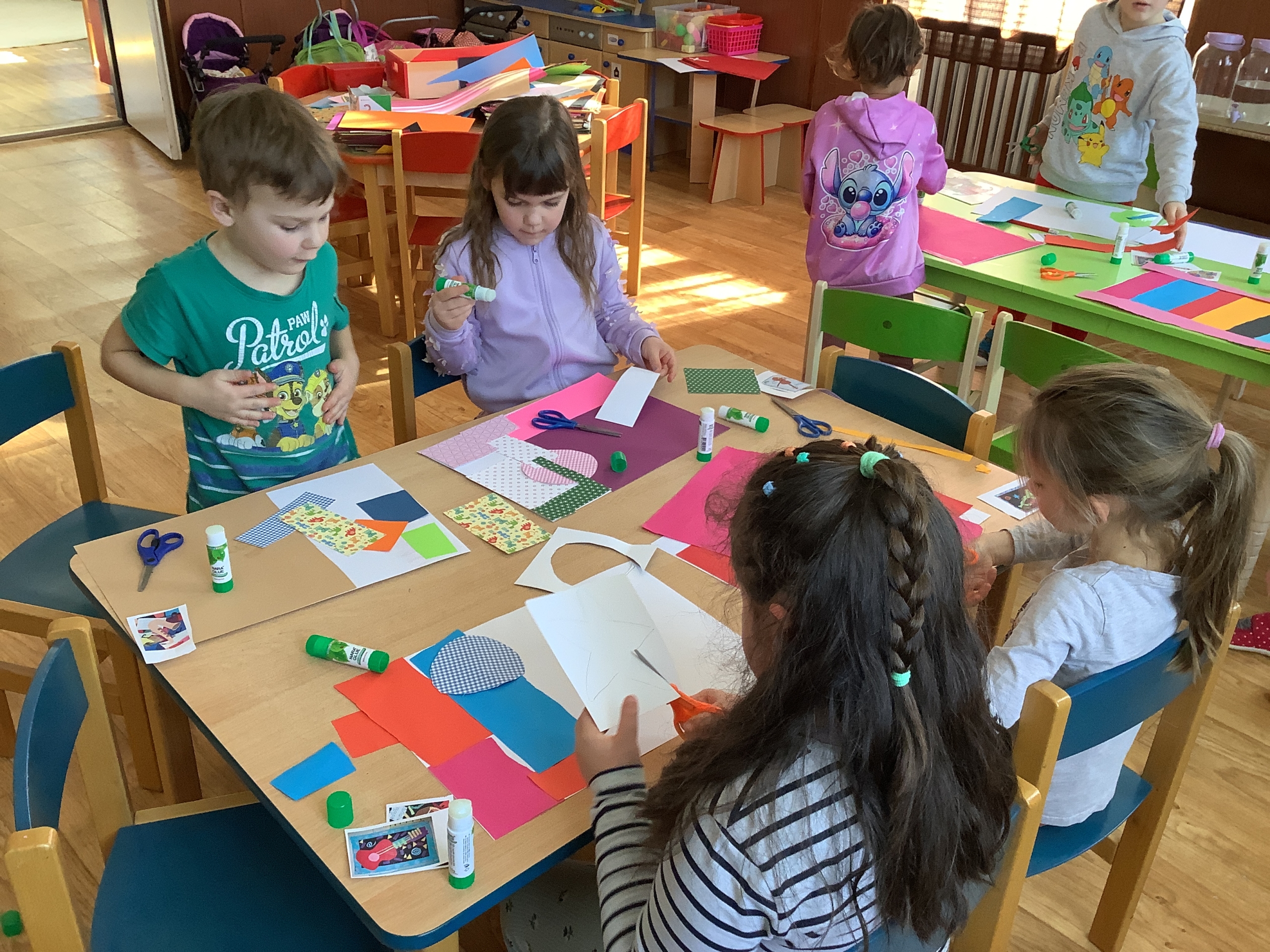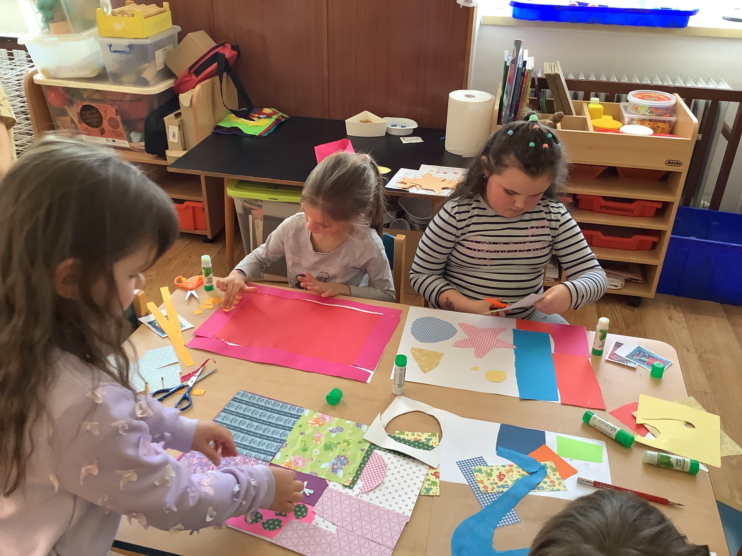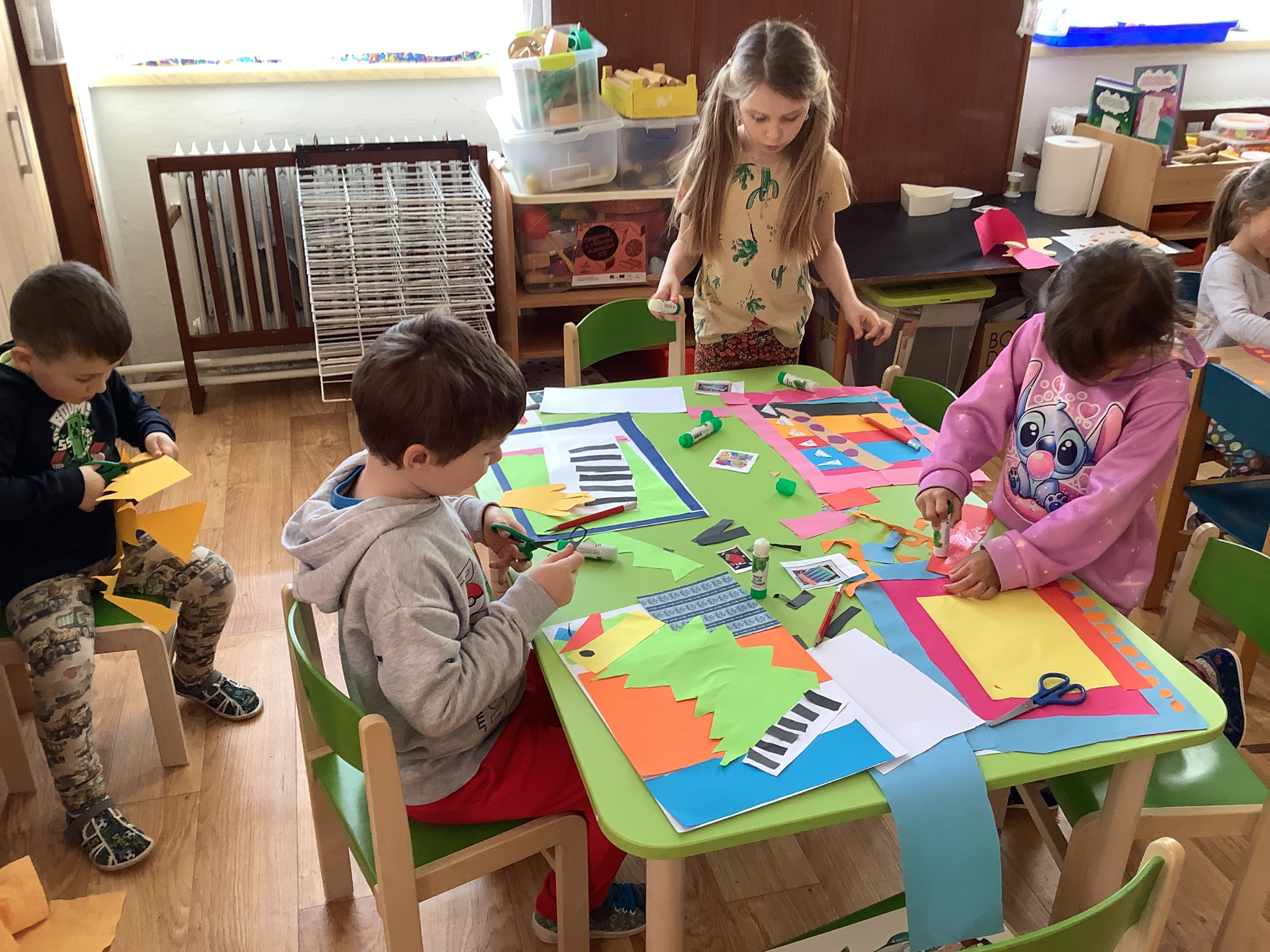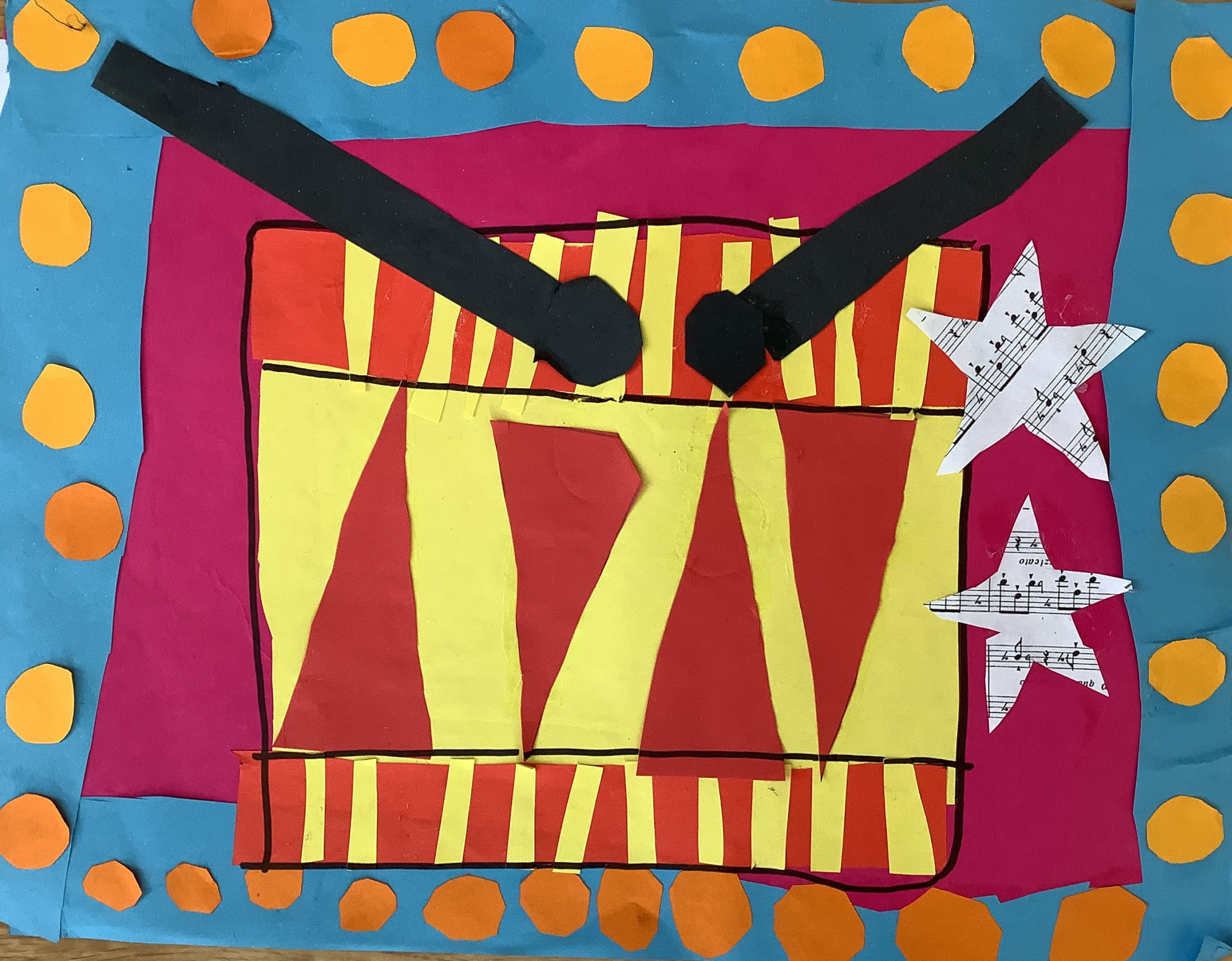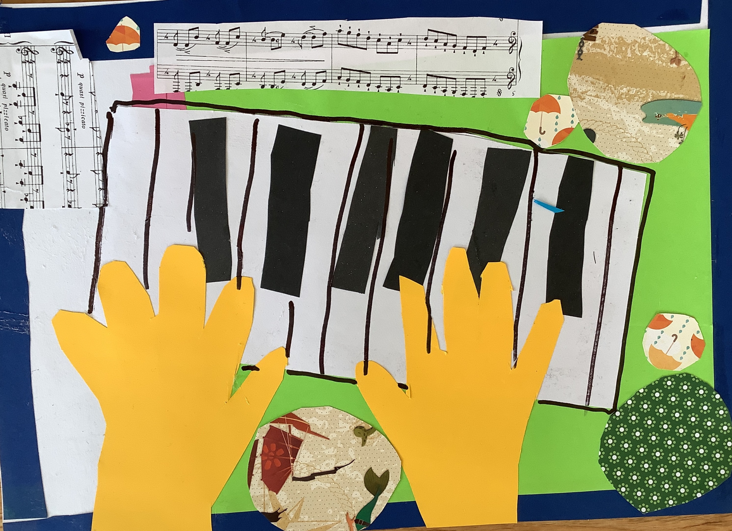 | Dílčí cíl: Vytvořit jednoduchou koláž skládáním a lepením papírových tvarů do podoby hudebního nástroje. Dokázat využít fantazii a stylizovat předmět netradičním způsobem podle vlastní představy. Pochopit, že obraz může být složený z tvarů a nemusí být realistický. |